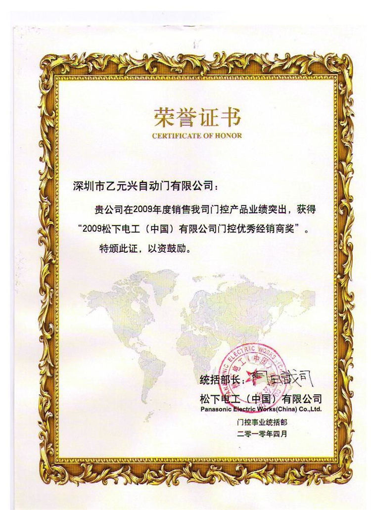 • 松下自動門經銷商證書